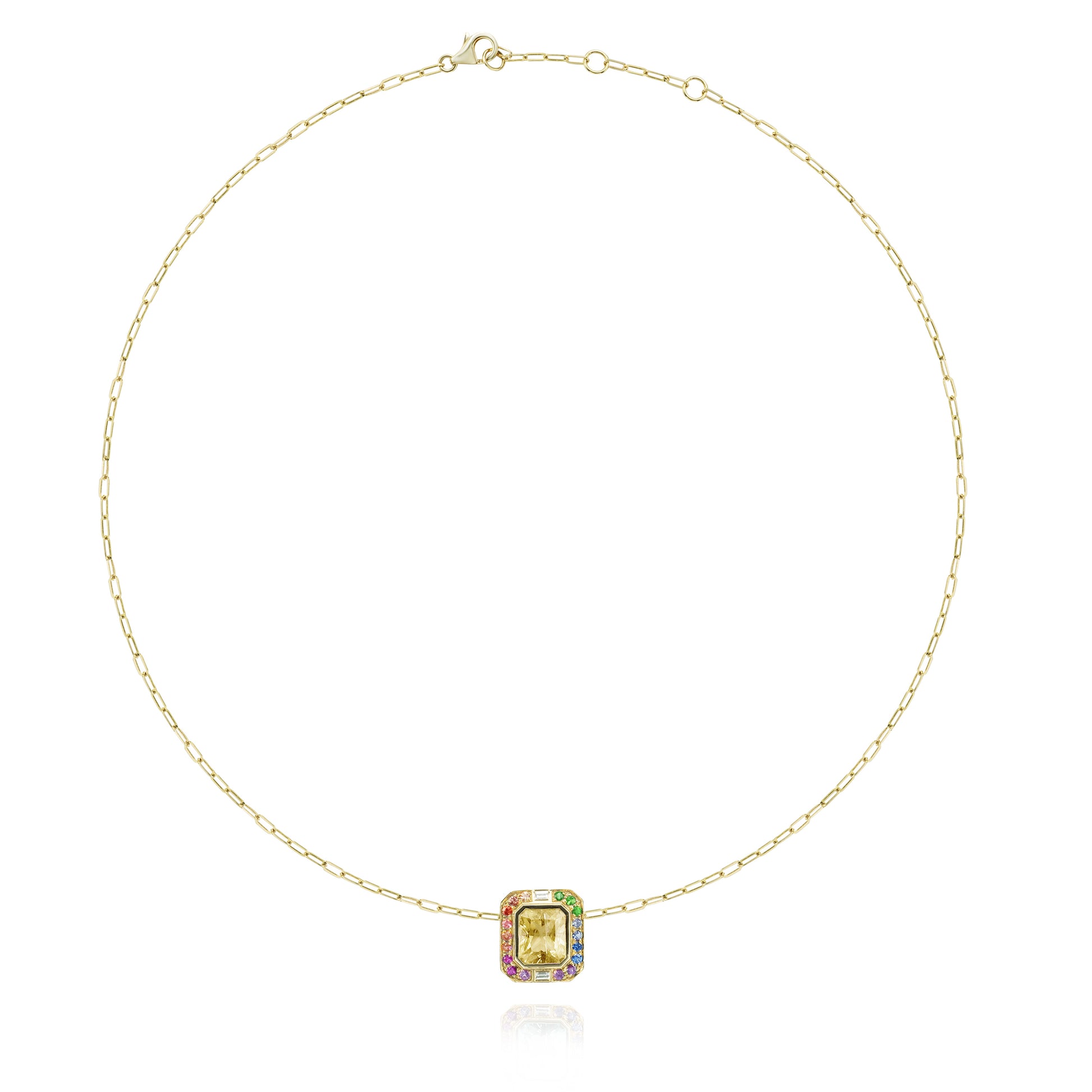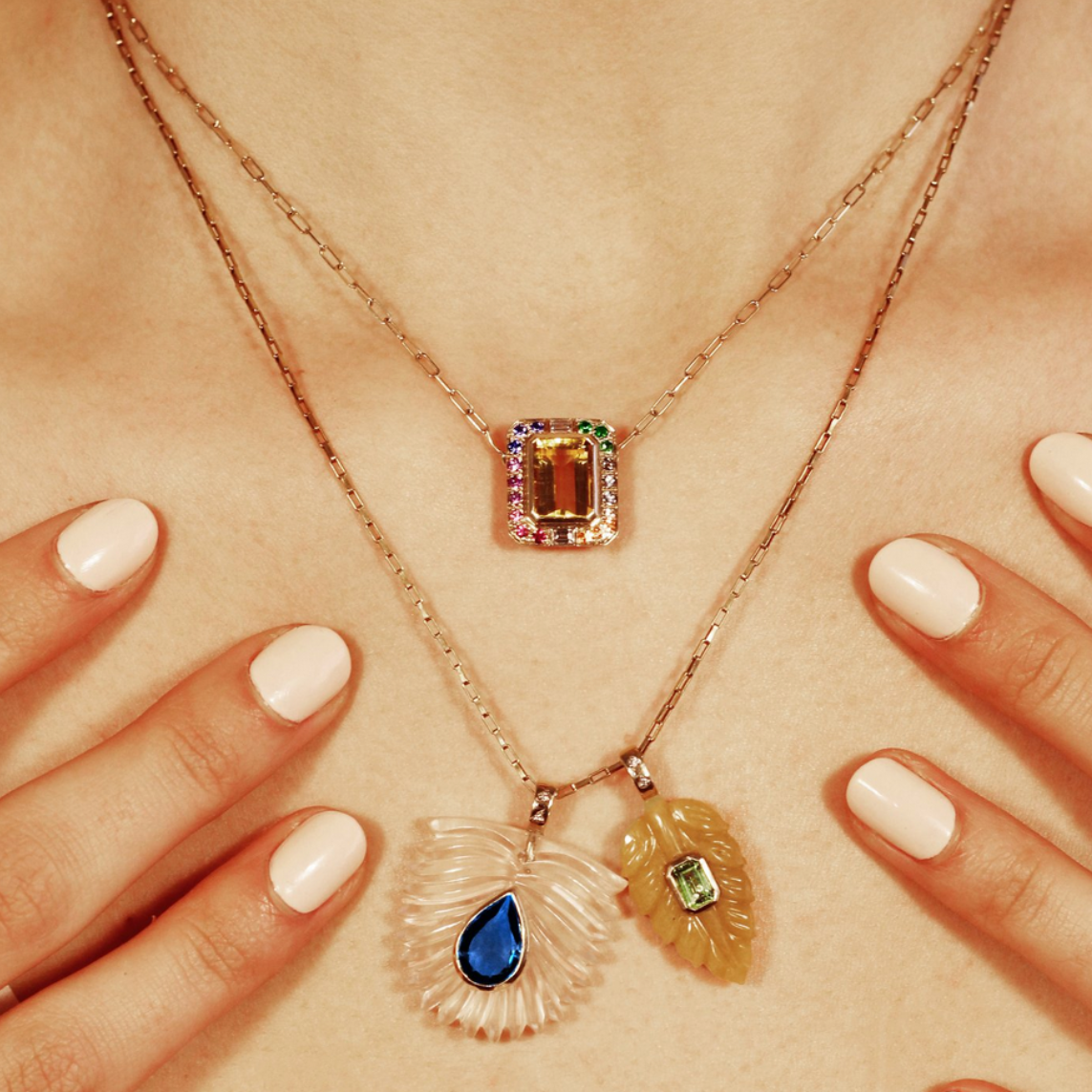 Abeele, c'est de l'avoir moderniser en le sertissant de dix-huit pierres précieuses et semi-précieuses en dégradé rainbow, rythmé par deux zircons baguette. Ce ravissant pendentif est monté sur une délicate chaîne aux maillons rectangulaires.