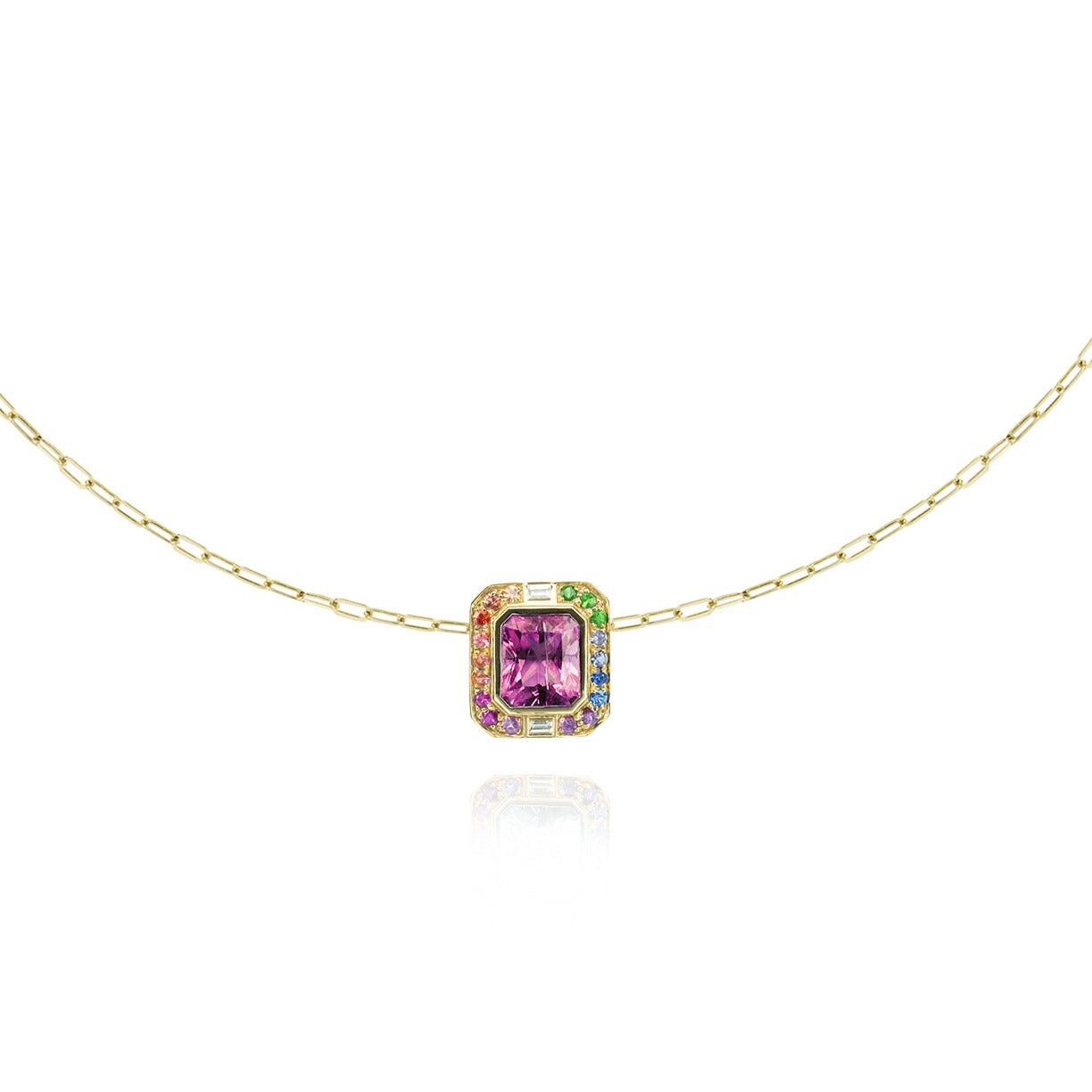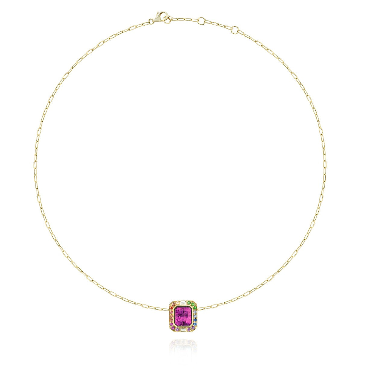 Sublime collier en or 18 carats avec en son centre un pendentif orné d'une tourmaline centrale qui rappelle le faste des années folles de style art déco. La forme octogonale du cabochon est un classique de cette époque très luxueuse, mais sa particularité qui est chère à la maison Van Den Abeele, c'est de l'avoir moderniser en le sertissant de seize pierres précieuses et semi-précieuses en dégradé rainbow, rythmé par deux zircons. Ce ravissant pendentif est monté sur une délicate chaîne aux maillons rectangulaires.