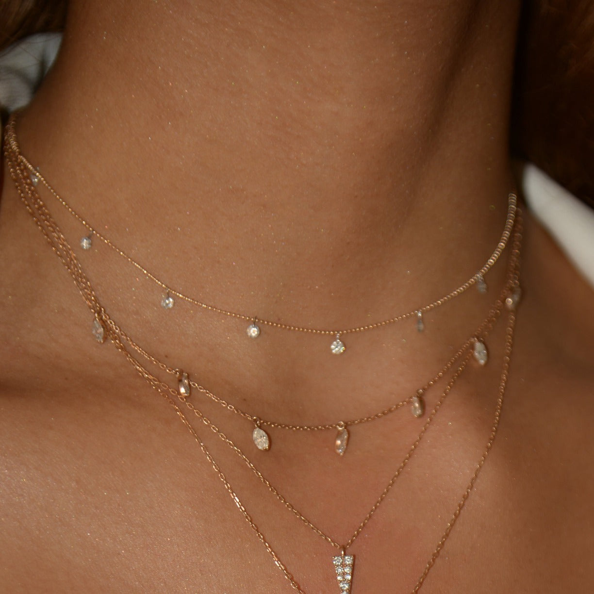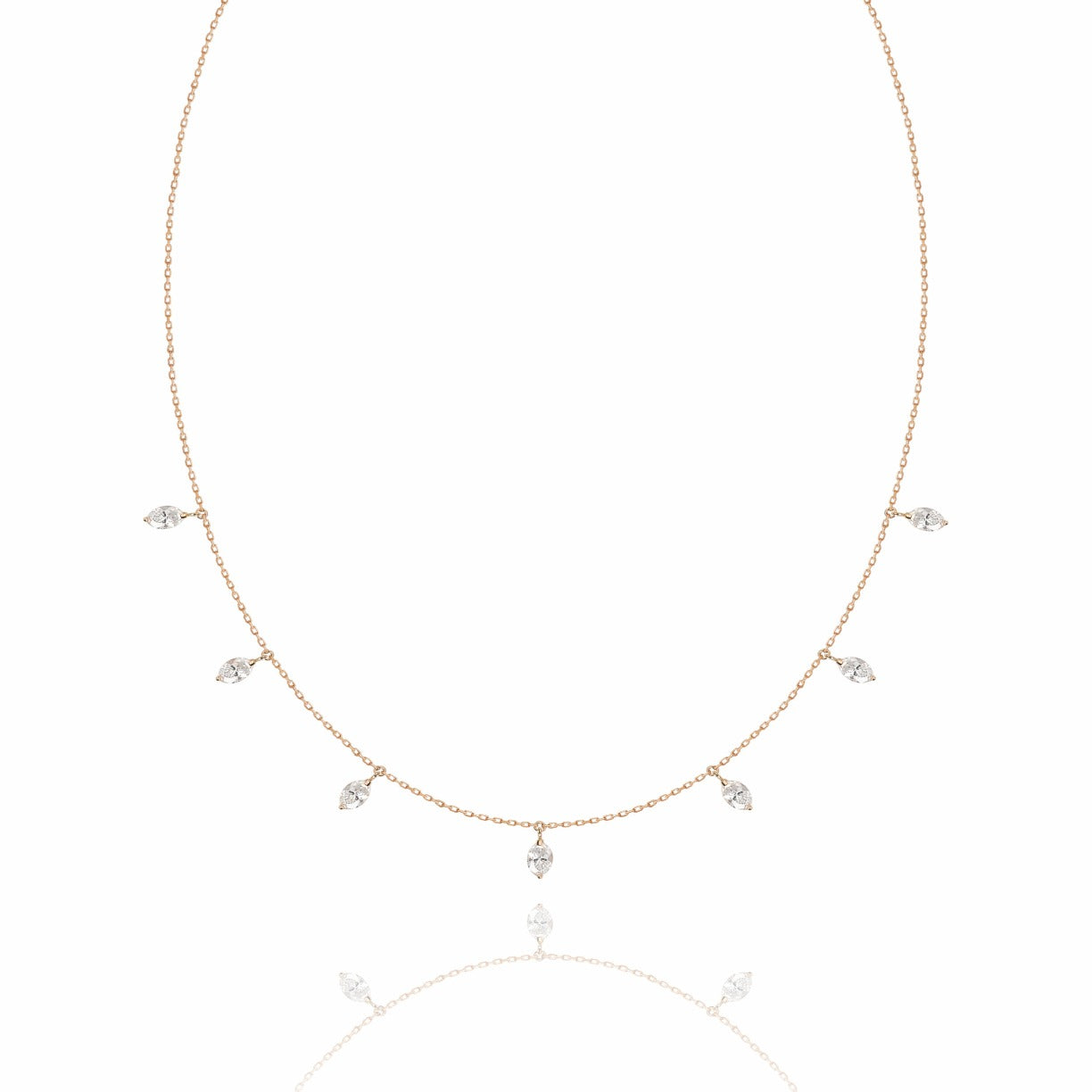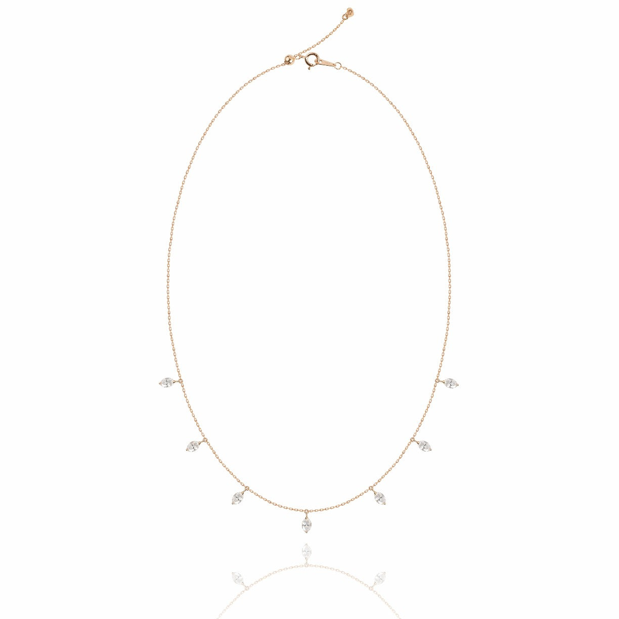 Collier en or rose 18 carats est une pièce d'une rare subtilité. Il est composé d'une chaîne fine en maille boule magnifiquement rehaussée de 7 petites pampilles, chacune sertie d'un magnifique diamants taille marquise qui scintilleront magnifiquement à votre cou. Une pièce élégante et sobre à la fois, parfaite avec une tenue de soirée qu'avec un outfit plus décontracté.