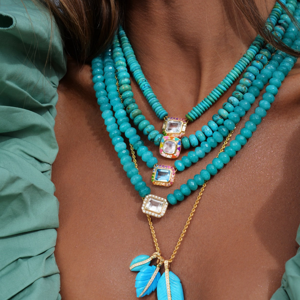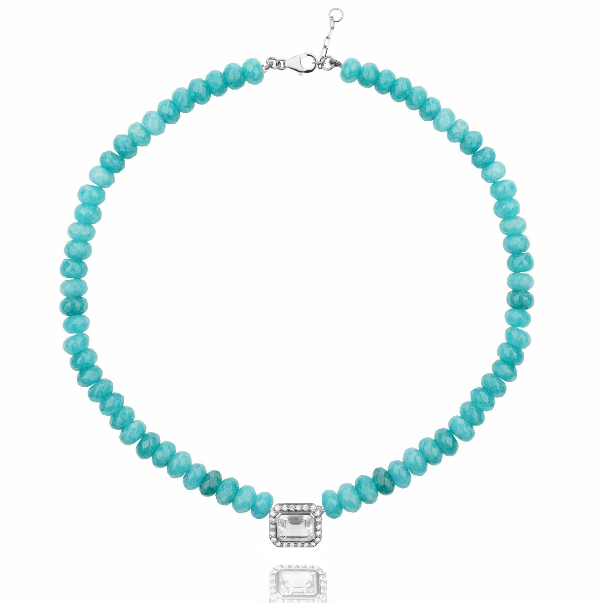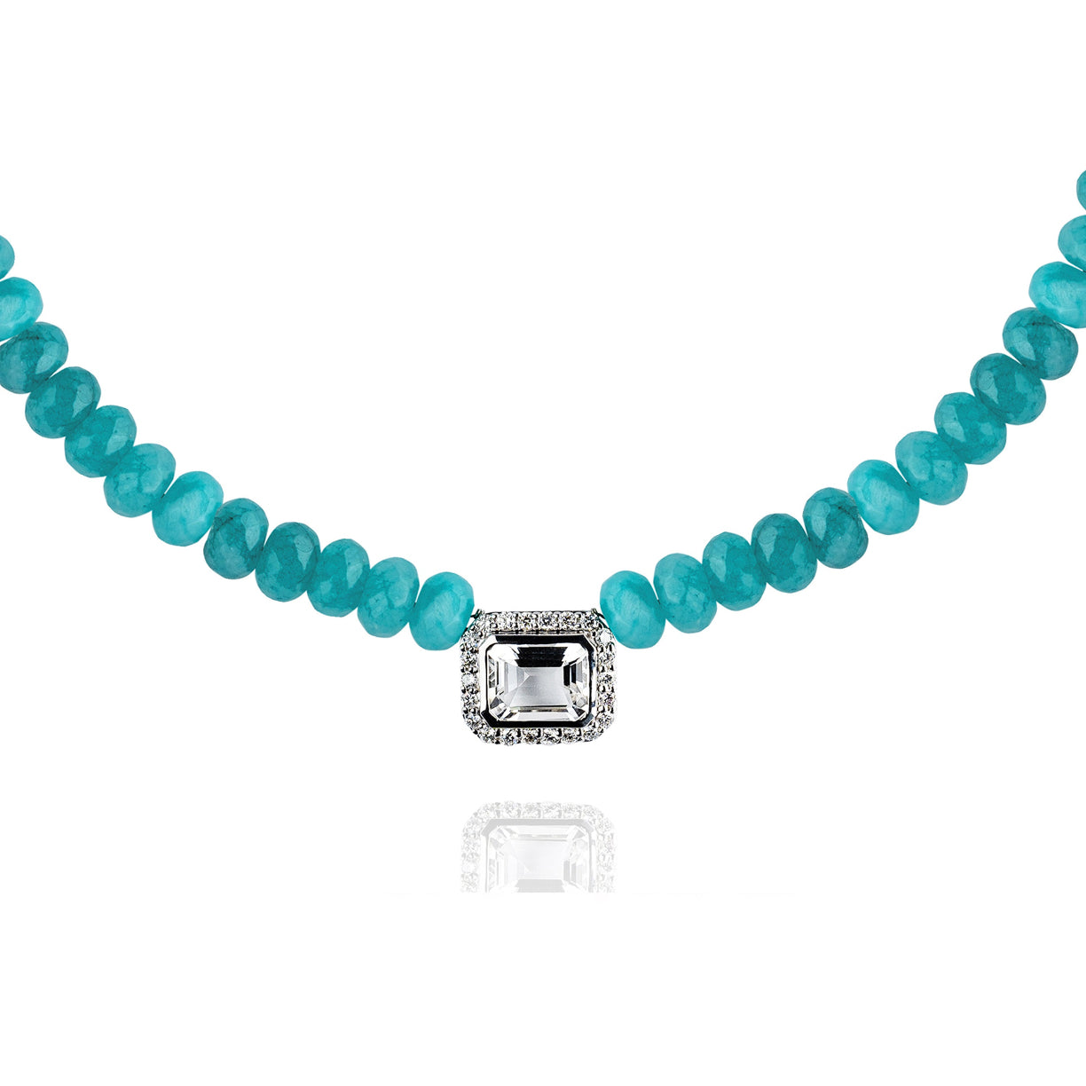 Ce collier en pierres Amazonite apporte chic et raffinement. Il est orné d'un cabochon en Quartz cristal de taille émeraude serti de diamants étincelants et rehaussé de deux zircons baguette. Cette pièce est un parfait mélange entre forme art déco et modernité excentrique.