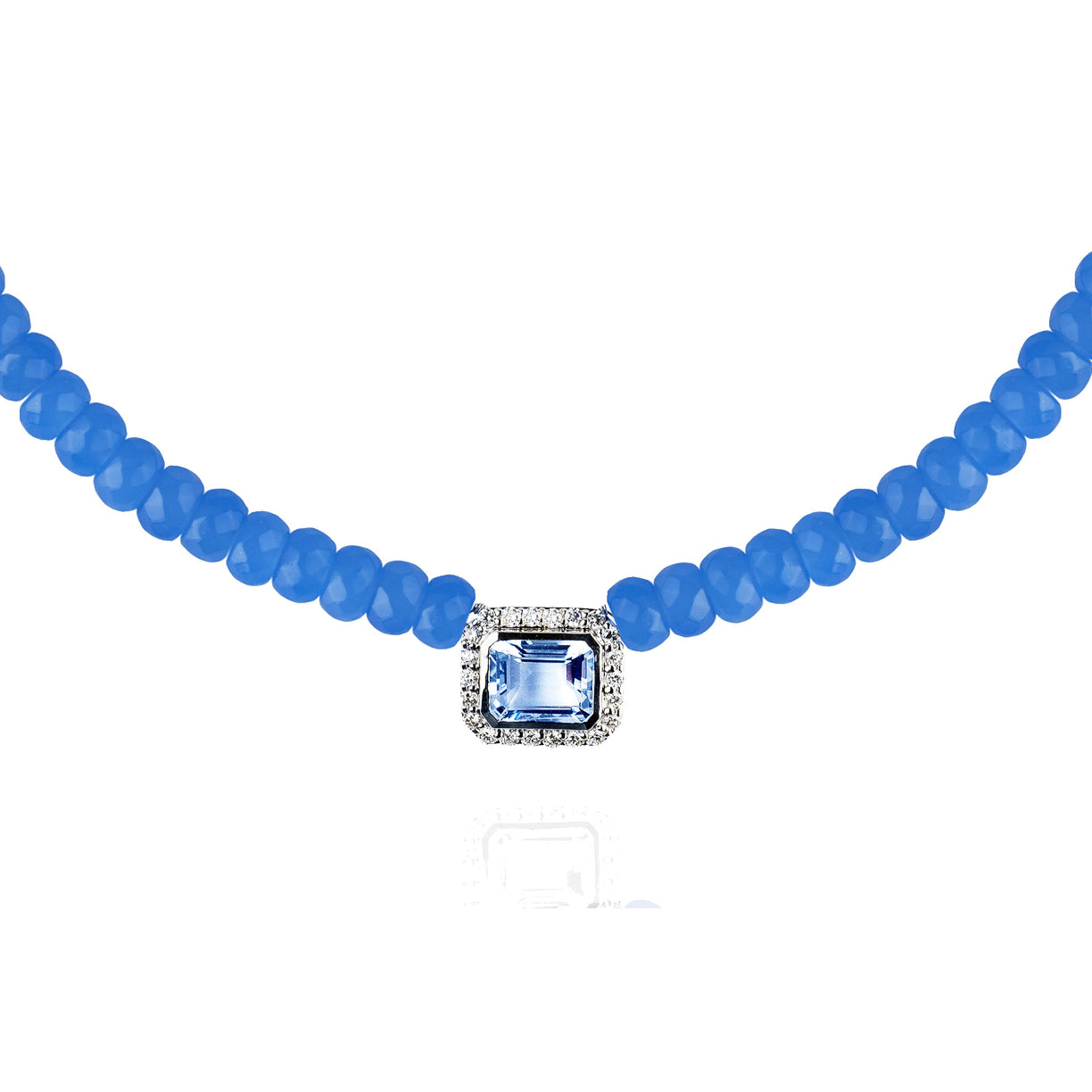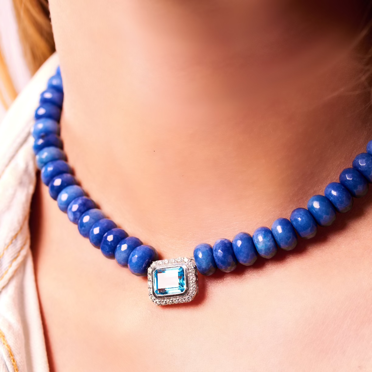 Collier ras du cou en perles de pierre Quartz, orné d'un cabochon central avec une Topaze et serti de diamants étincelants.