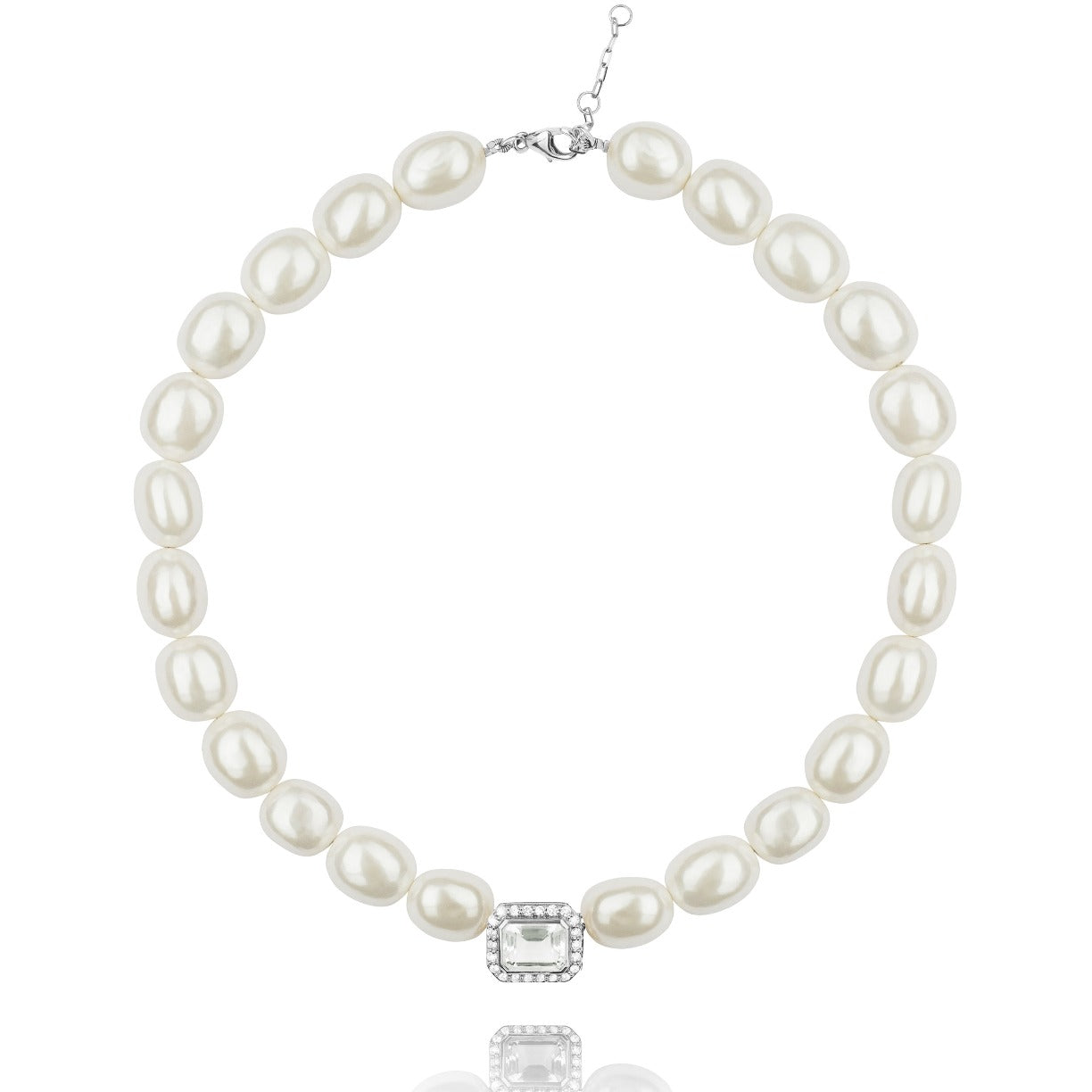 Ce collier en perles de coquillages apporte chic et raffinement. Il est orné d'un cabochon en argent 925 décoré d'un Quartz cristal central de taille émeraude serti de ravissants diamants. Cette pièce est un parfait mélange entre forme art déco et modernité excentrique.