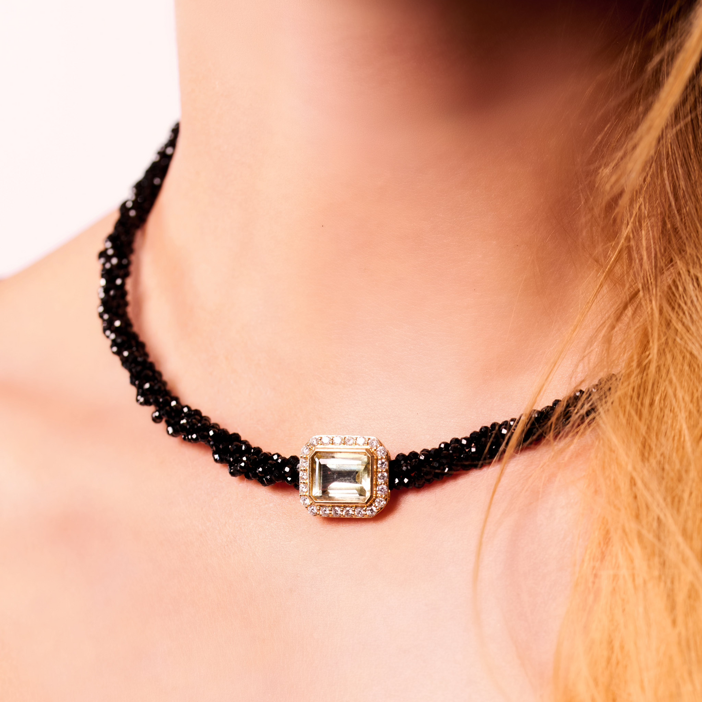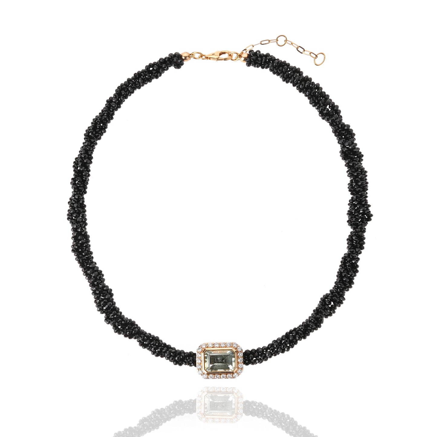 Collier en liens de perles en pierre Zircon noir avec cabochon en or jaune 14k orné de diamants et d'une améthyste verte centrale.