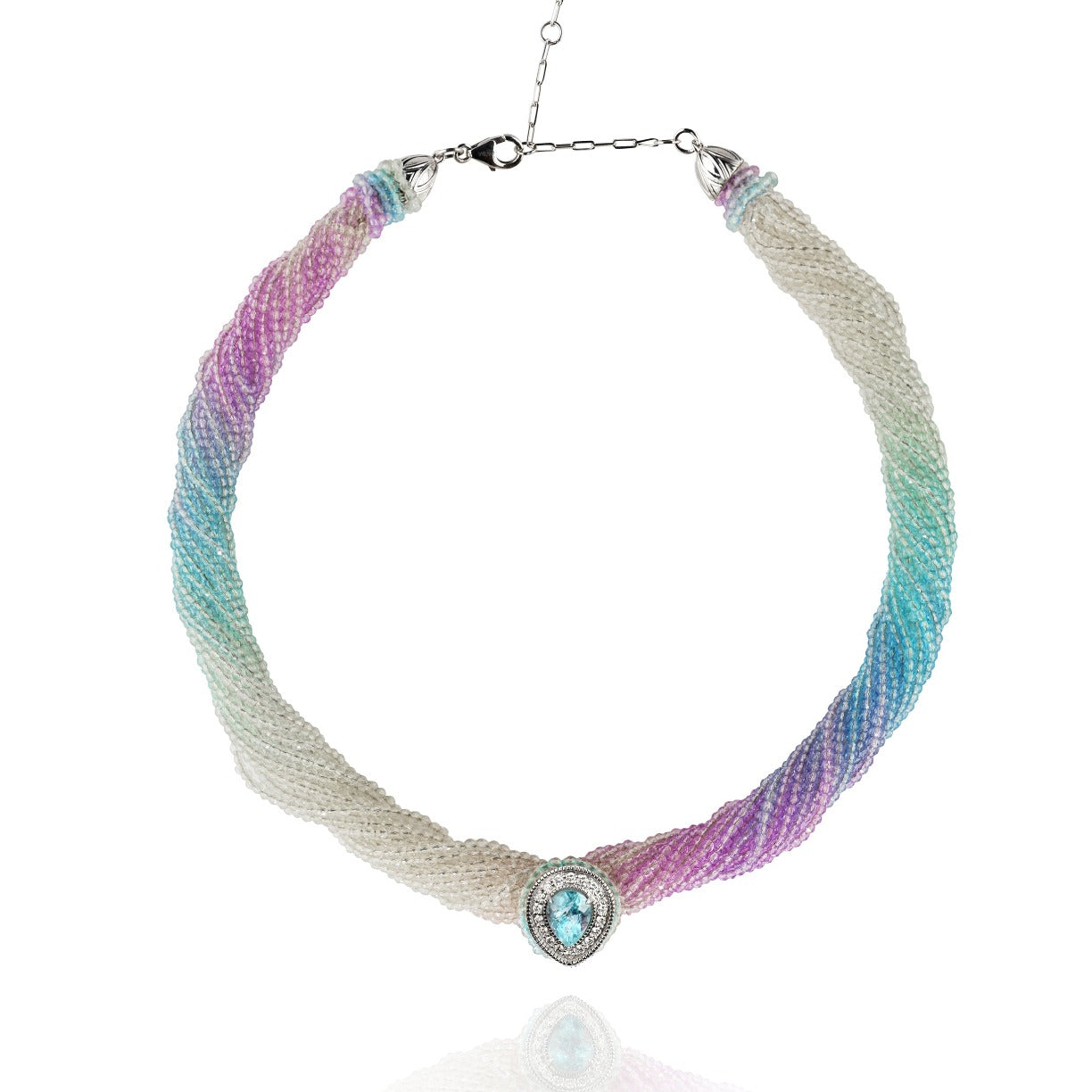 Collier en liens de perles en pierre de Cristal avec cabochon en argent 925 orné de diamants et d'une Apatite centrale.