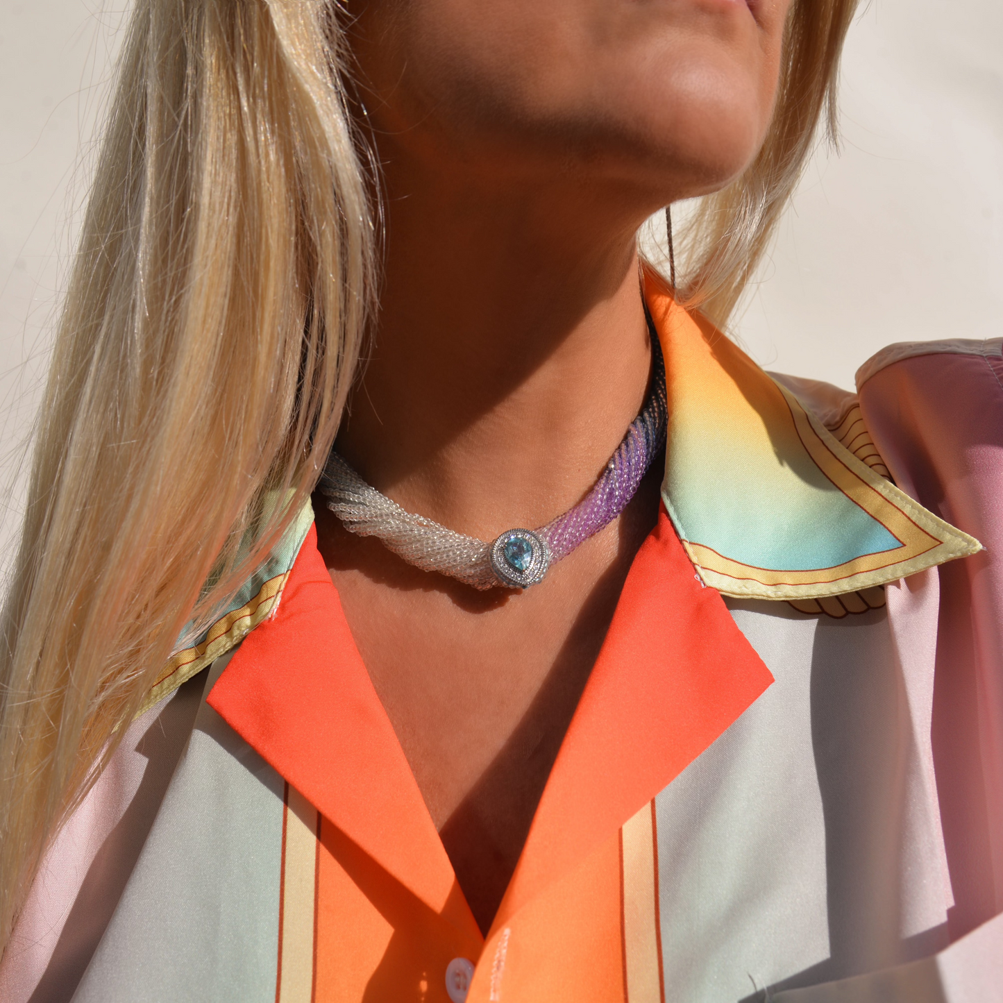 Dans la lignée du Molly String avec sa structure aux liens multiples, le Tornado, s'inscrit comme une nouvelle pièce iconique de notre maison. Ses liens torsadés autour du cabochon central, composé d’argent 925 et serti de diamants, il dévoile toute la beauté d'une Apatite sertie en son centre. Portez-le seul, en ras de cou, pour sublimer votre port de tête ou associé à nos pendentifs Plume ou Feuille montés sur chaîne pour créer un jeu de longueurs, le Tornado deviendra la pièce maîtresse de votre style.