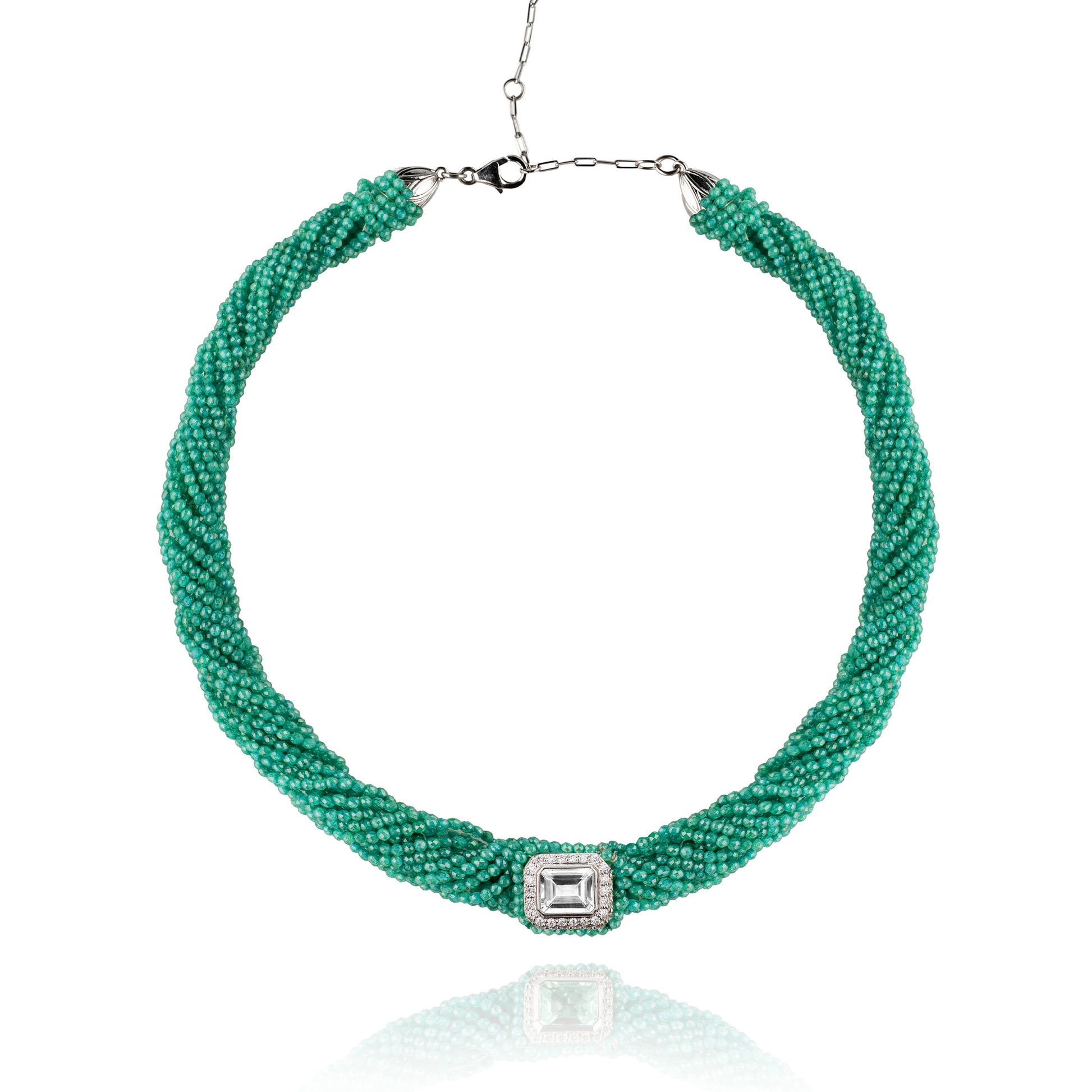 Collier en liens de perles en Zircon émeraude avec cabochon en argent 925 orné de diamants et d'un Quartz cristal central.