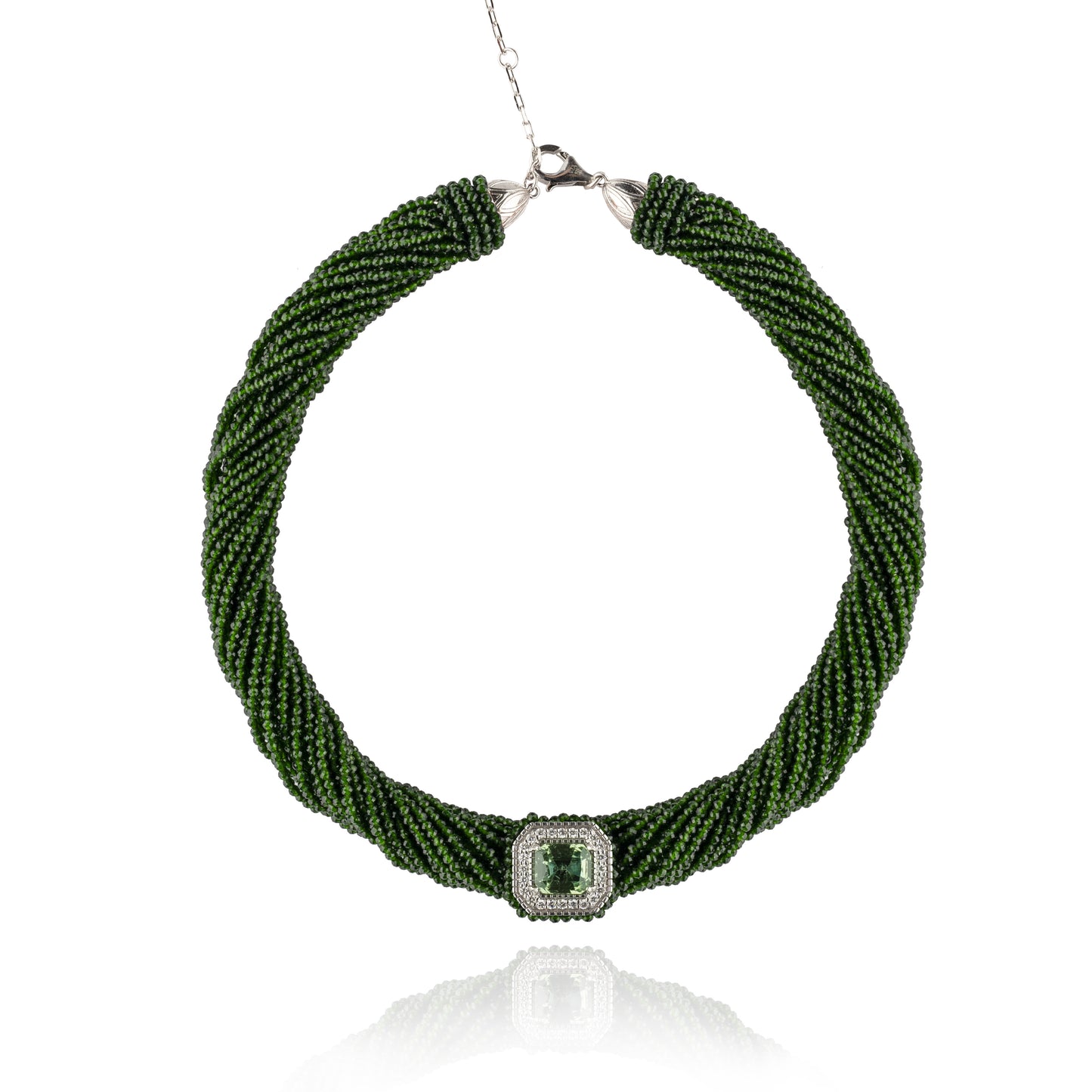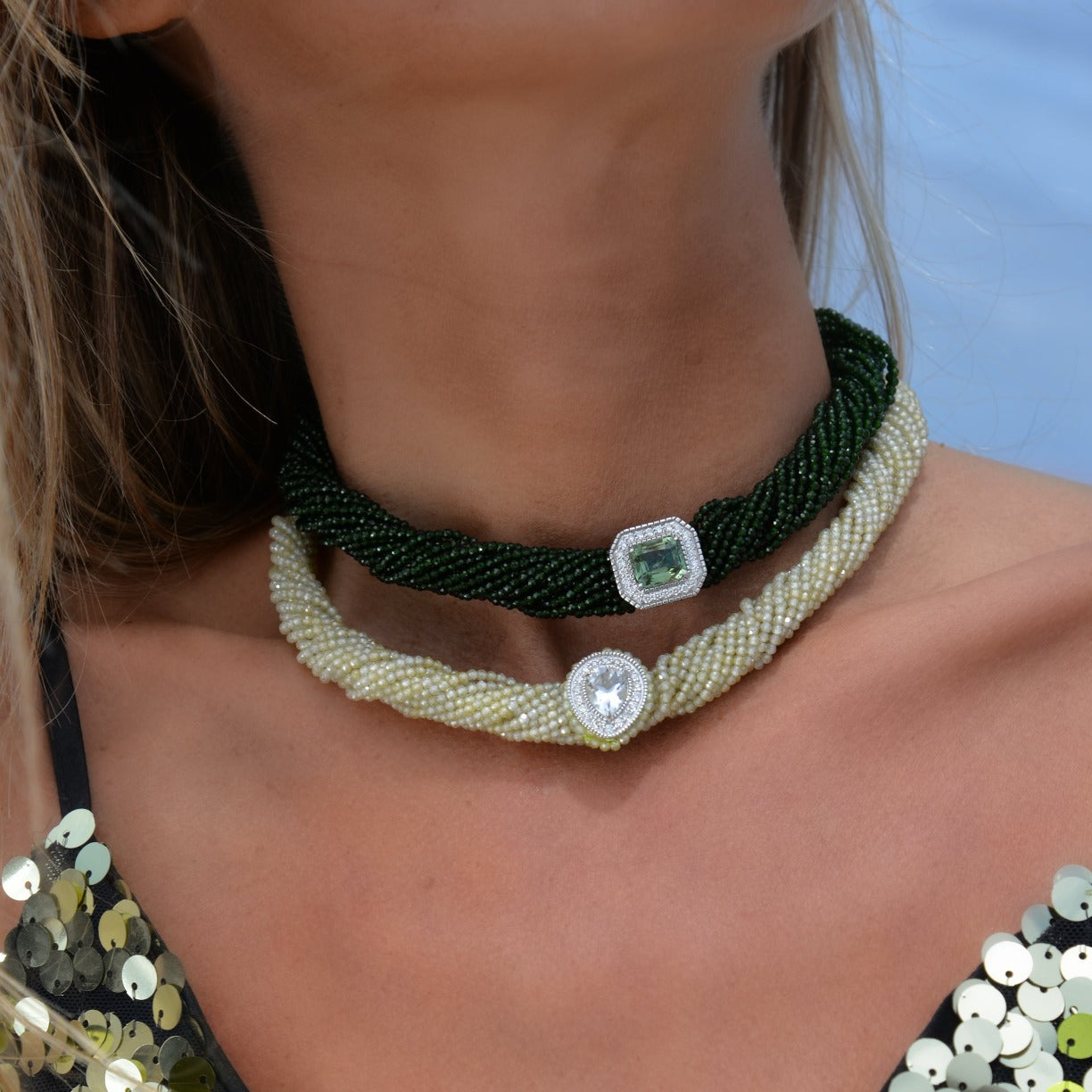 Collier en liens de perles en pierre de Zircon vert avec cabochon en argent 925 orné de diamants et d'une Apatite verte centrale.
