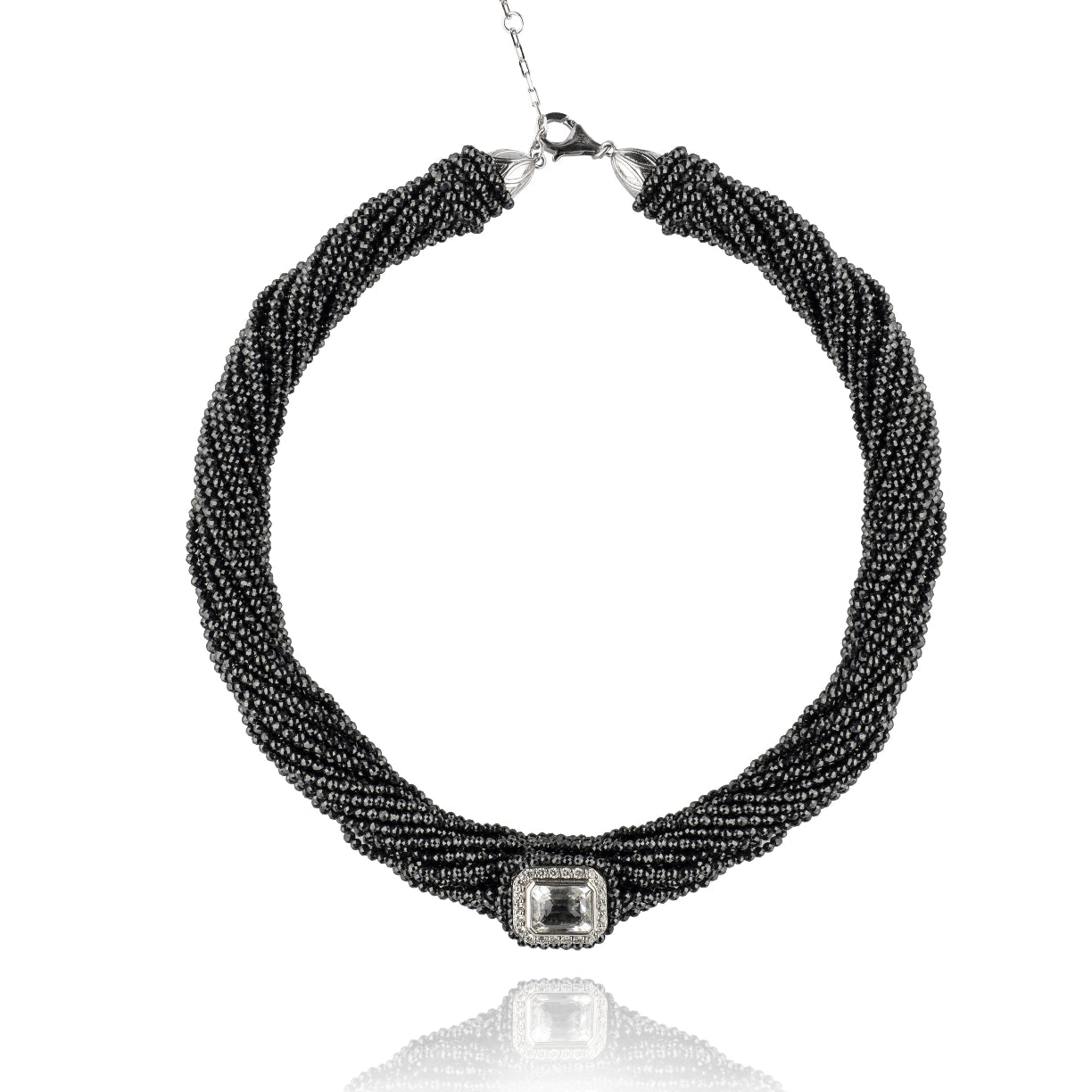 Collier en liens de perles en pierre de Zircon noir avec cabochon en argent 925 orné de diamants et d'un Cristal.