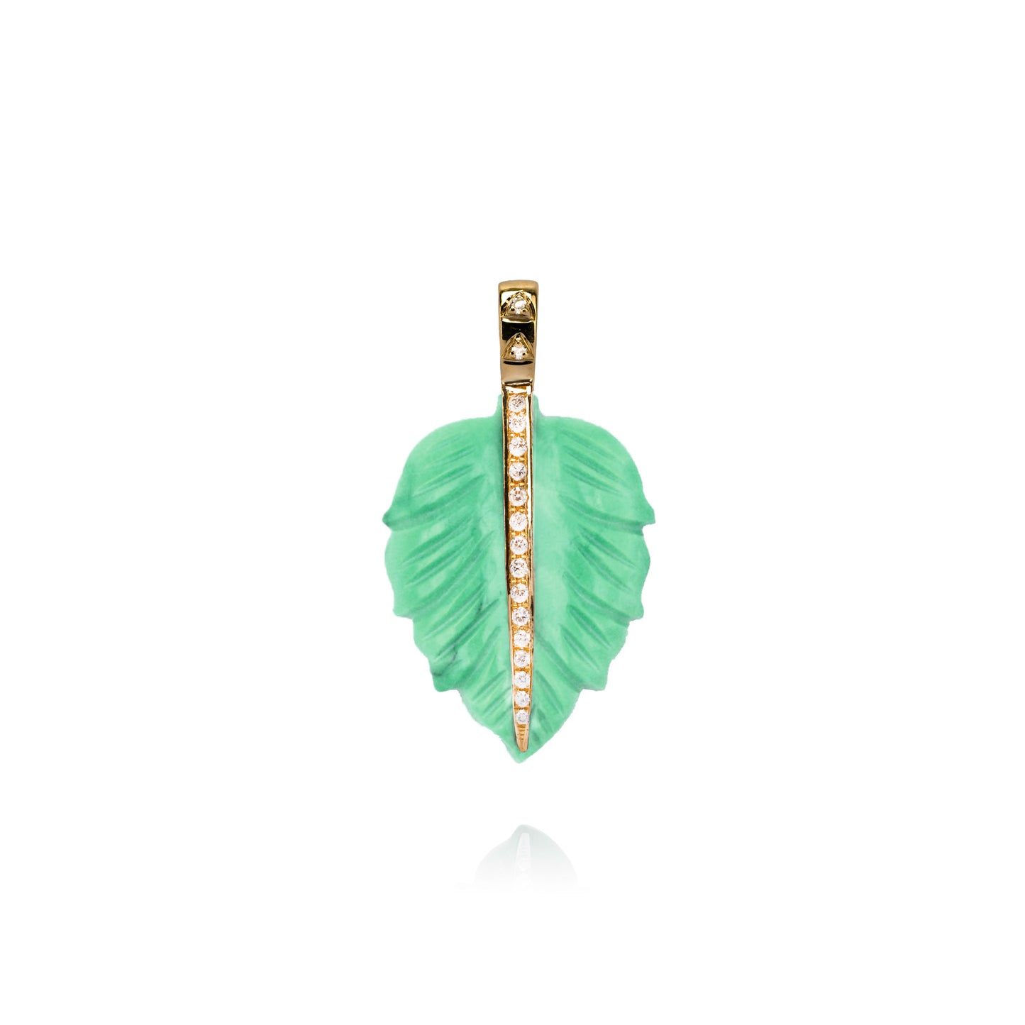 Ravissant pendentif en chrysoprase représentant une délicate feuille. Elle est sculptée à même la pierre selon la technique du carving. Cette feuille est pavée de 17 diamants sur un serti d’or jaune 14 carats. La feuille est le symbole du bonheur et de la prospérité. Ce pendentif peut aussi bien être porté sur une chaîne fine que plus épaisse grâce à sa bélière en or 17 carats décorée de petits diamants, qui est suffisamment large pour laisser passer des maillons de 3mm de diamètre. Pourquoi pas, également, porter ce magnifique bijoux sur une créole pour un look 100% fashion.