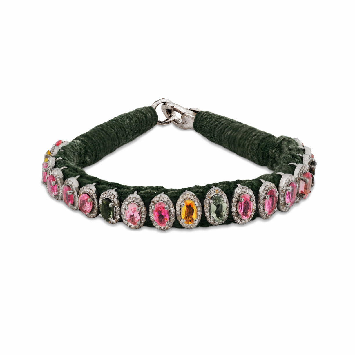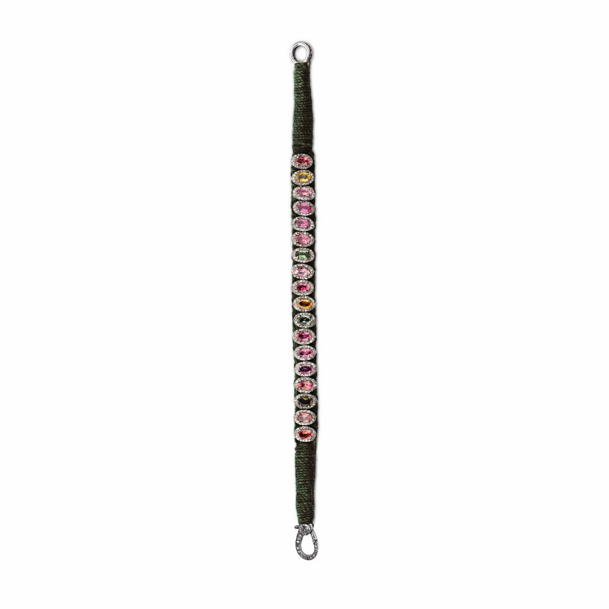 Bracelet fin en fil de coton tressé de couleur kaki. Il est orné de multiples petits ovales en argent intégralement sertis de plus de 200 diamants et rehaussés, en leur centre, de Tourmalines multicolores.