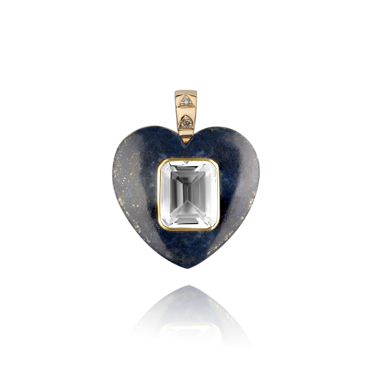 Pendentif représentant un cœur en Lapis, quartz cristal, diamants et or 14 carats.