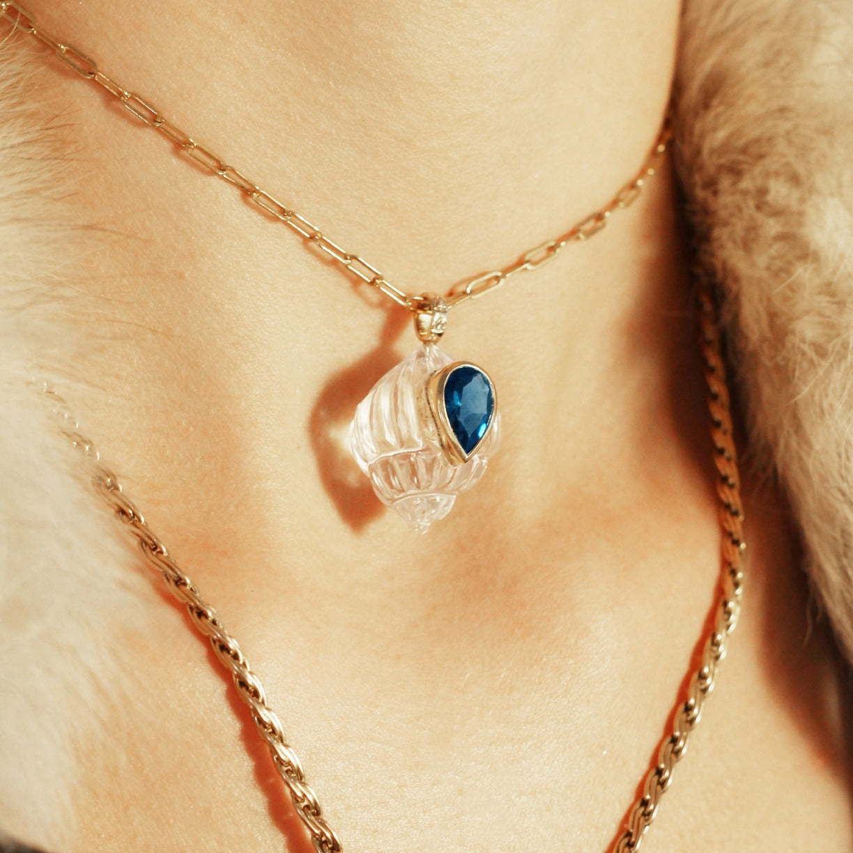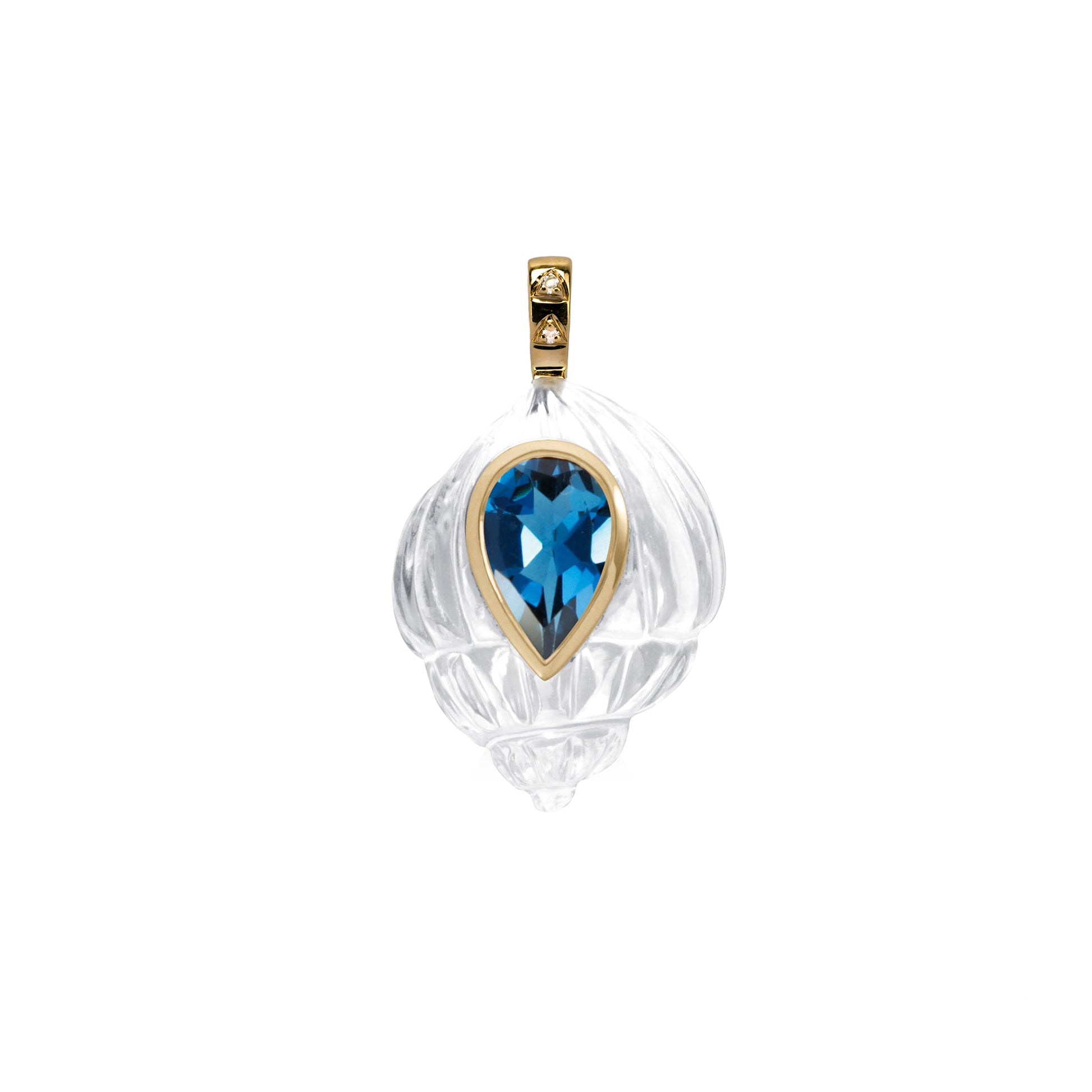 Pendentif coquillage en Quartz cristal, topaze bleu London, diamants et or 14 carats.