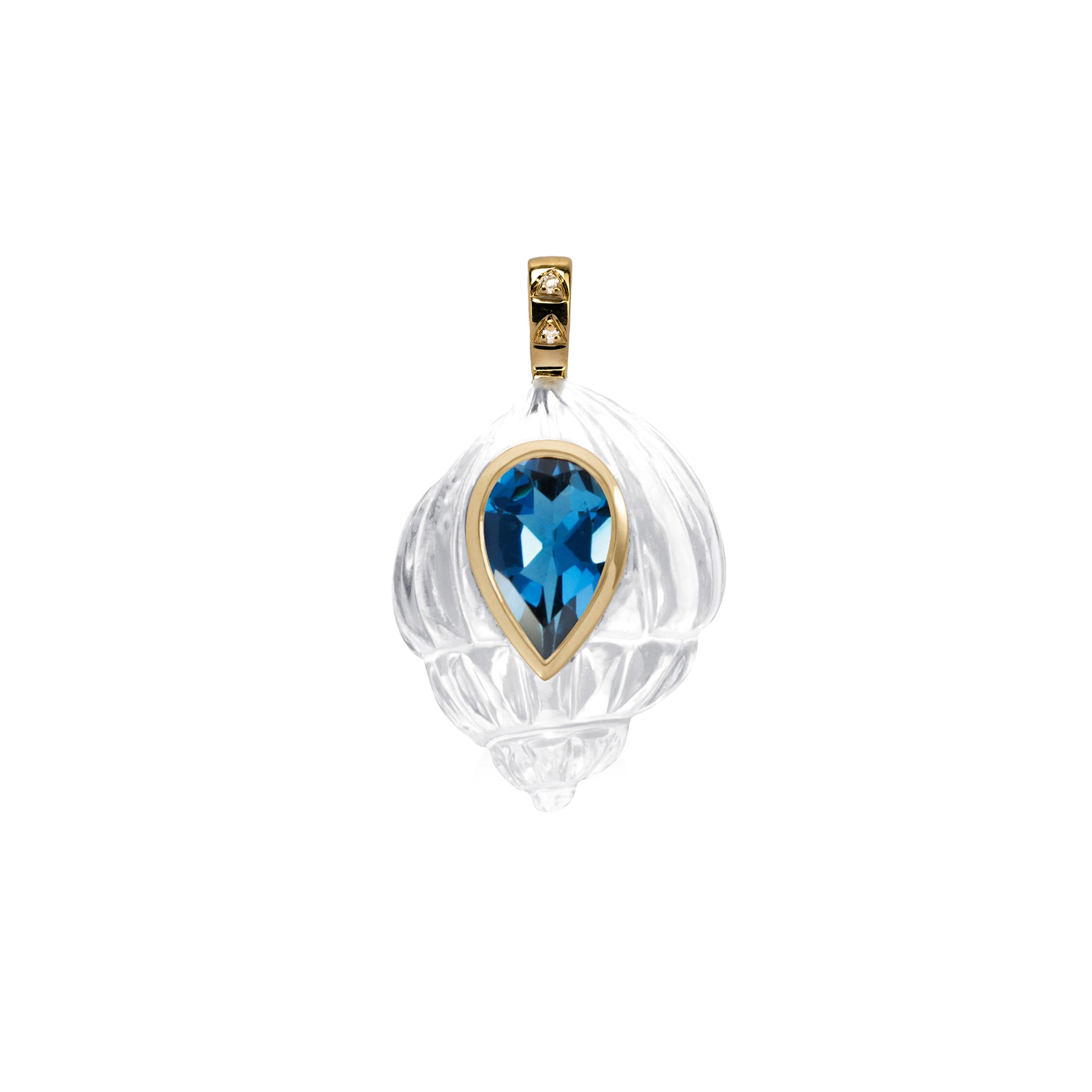 Ravissant pendentif en améthyste représentant un magnifique coquillage. Ce pendentif est sculpté à même la pierre selon la technique du carving. Ce coquillage est délicatement serti en son centre d'une magnifique améthyste verte taille poire. Le coquillage est une invitation aux voyages lointains bordés d’eau turquoise. Ce pendentif peut aussi bien être porté sur une chaîne fine que plus épaisse grâce à sa bélière en or 14 carats décorée de deux petits diamants, qui est suffisamment large pour laisser passer des maillons de 3mm de diamètre. Pourquoi pas, également, porter ce magnifique bijoux sur une créole pour un look 100% fashion.
