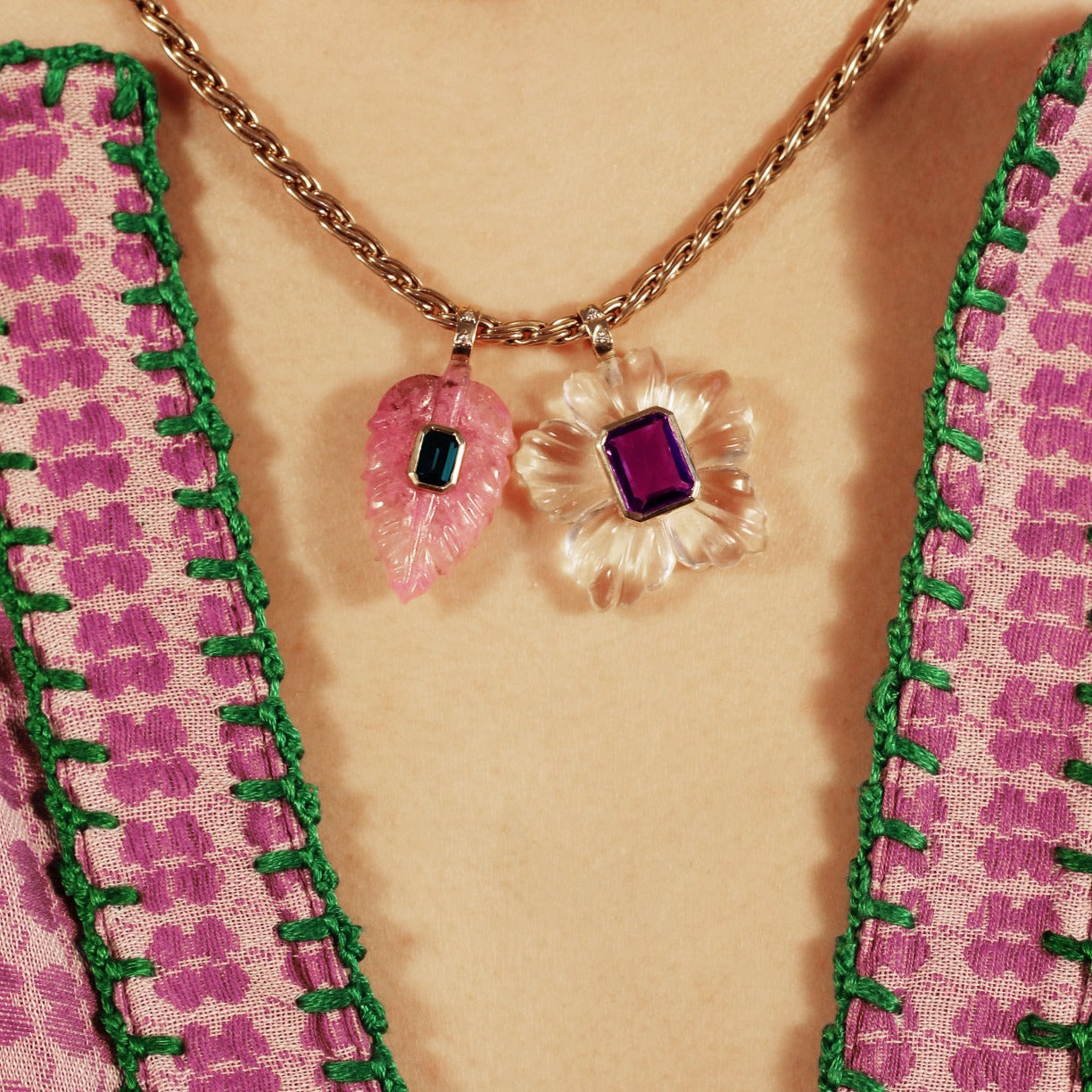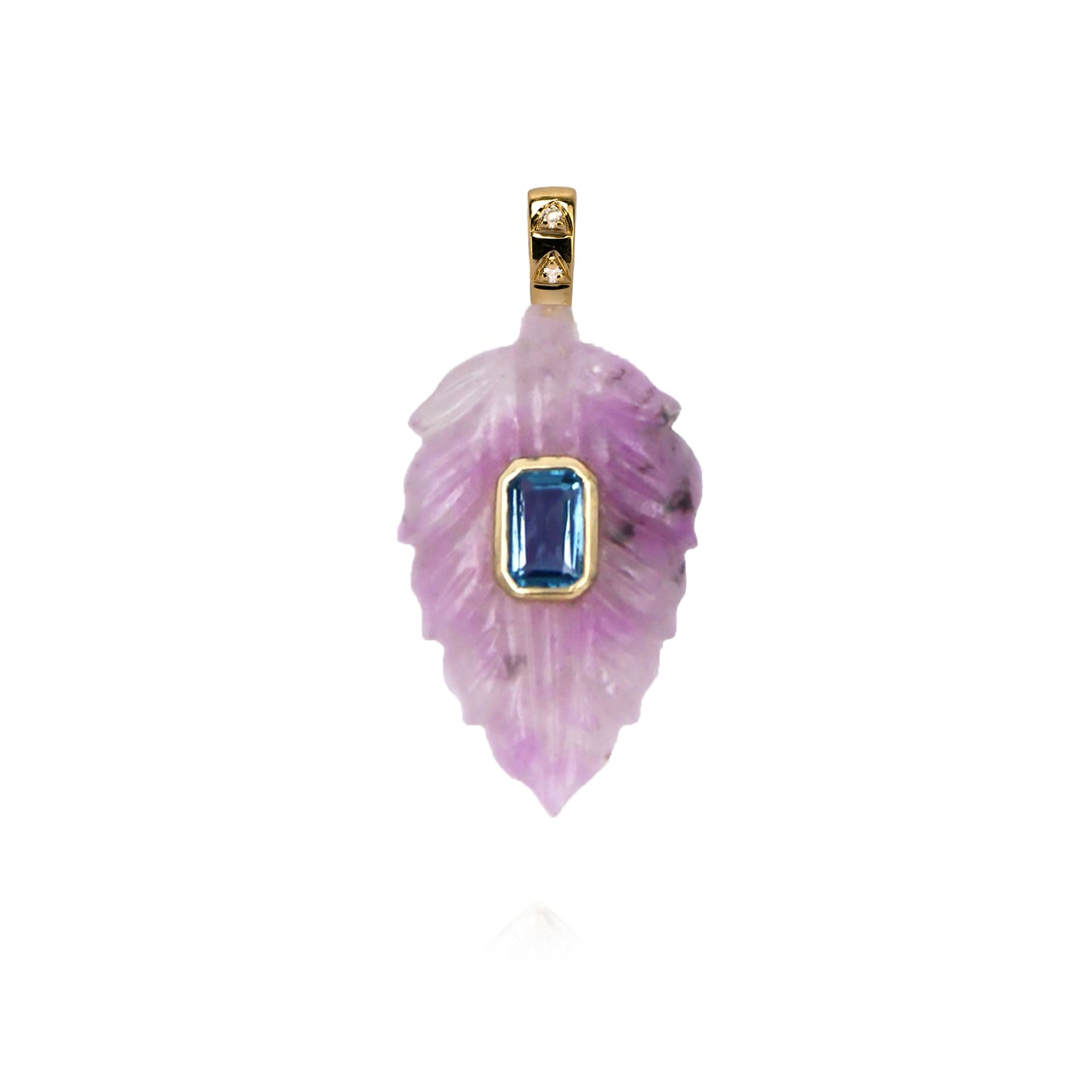 Pendentif représentant une feuille en Jade, topaze blue London, diamants et or 14 carats.