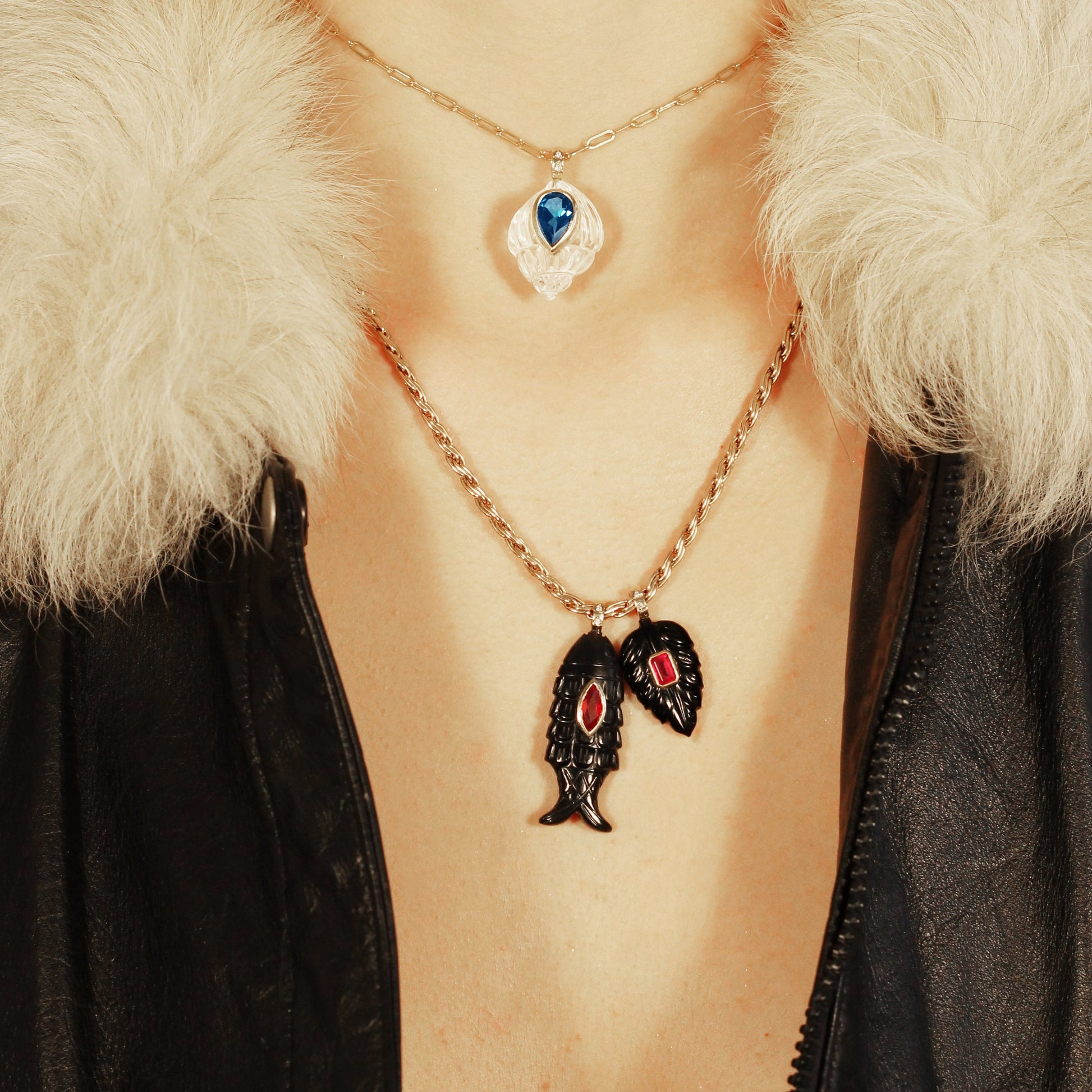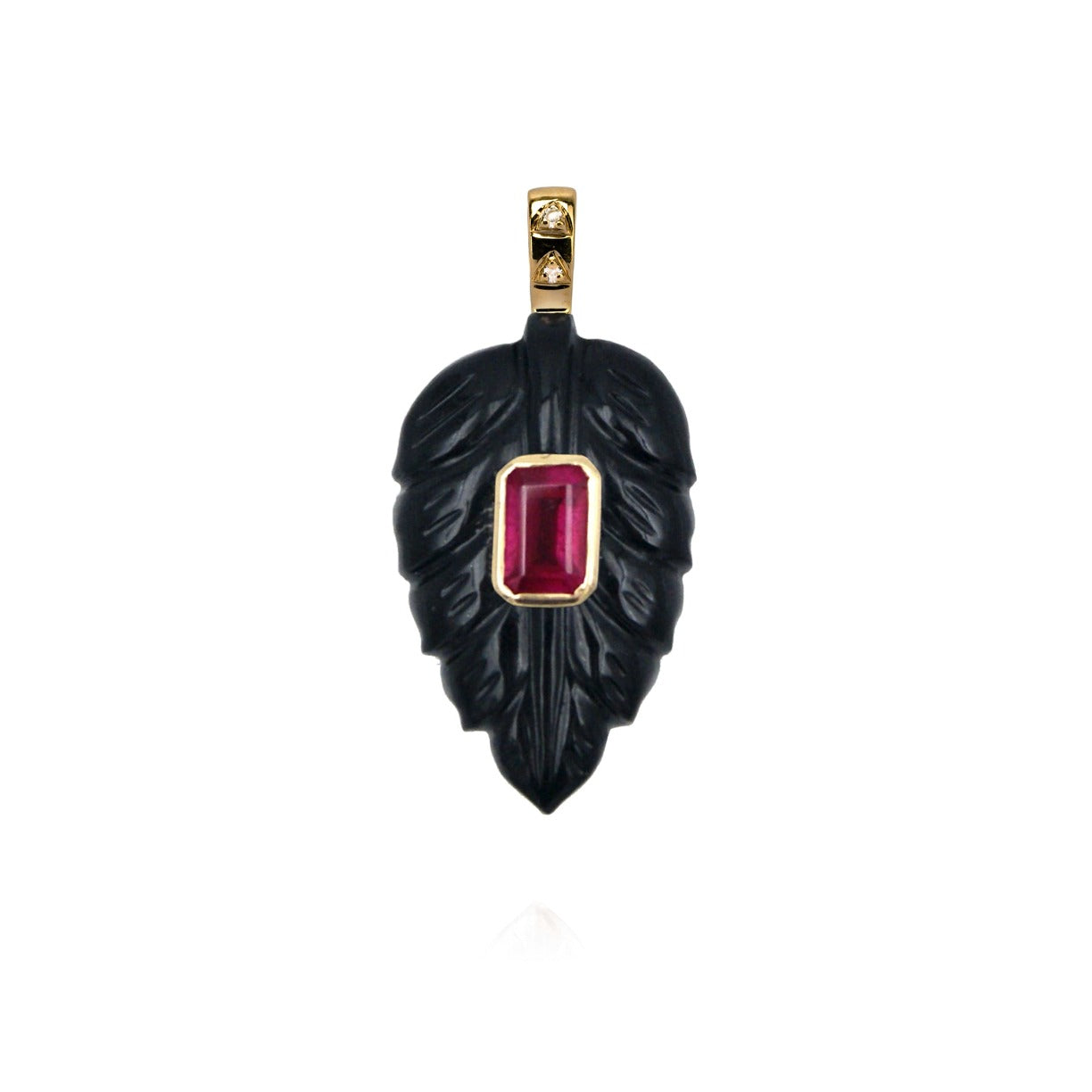 Pendentif représentant une feuille en Onyx, rubis, diamants et or 14 carats.