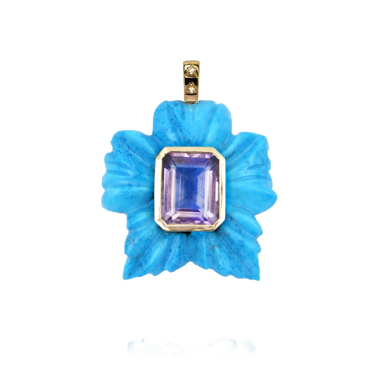 Ravissant pendentif en Turquoise représentant une sublime fleur. Ce pendentif est sculpté à même la pierre selon la technique du carving. Cette fleur est sertie en son centre d'une améthyste de taille émeraude. La fleur peut être le symbole d’une amitié mais aussi la joie et l’espoir. Ce pendentif peut aussi bien être porté sur une chaîne fine que plus épaisse grâce à sa bélière en or 14 carats décorée de deux petits diamants, qui est suffisamment large pour laisser passer des maillons de 3mm de diamètre. Pourquoi pas, également, porter ce magnifique bijoux sur une créole pour un look 100% fashion.