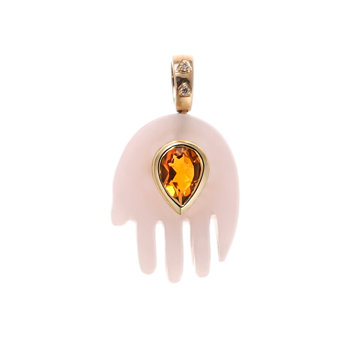 Pendentif représentant une main en Opale rose, citrine, diamants et or 18 carats.
