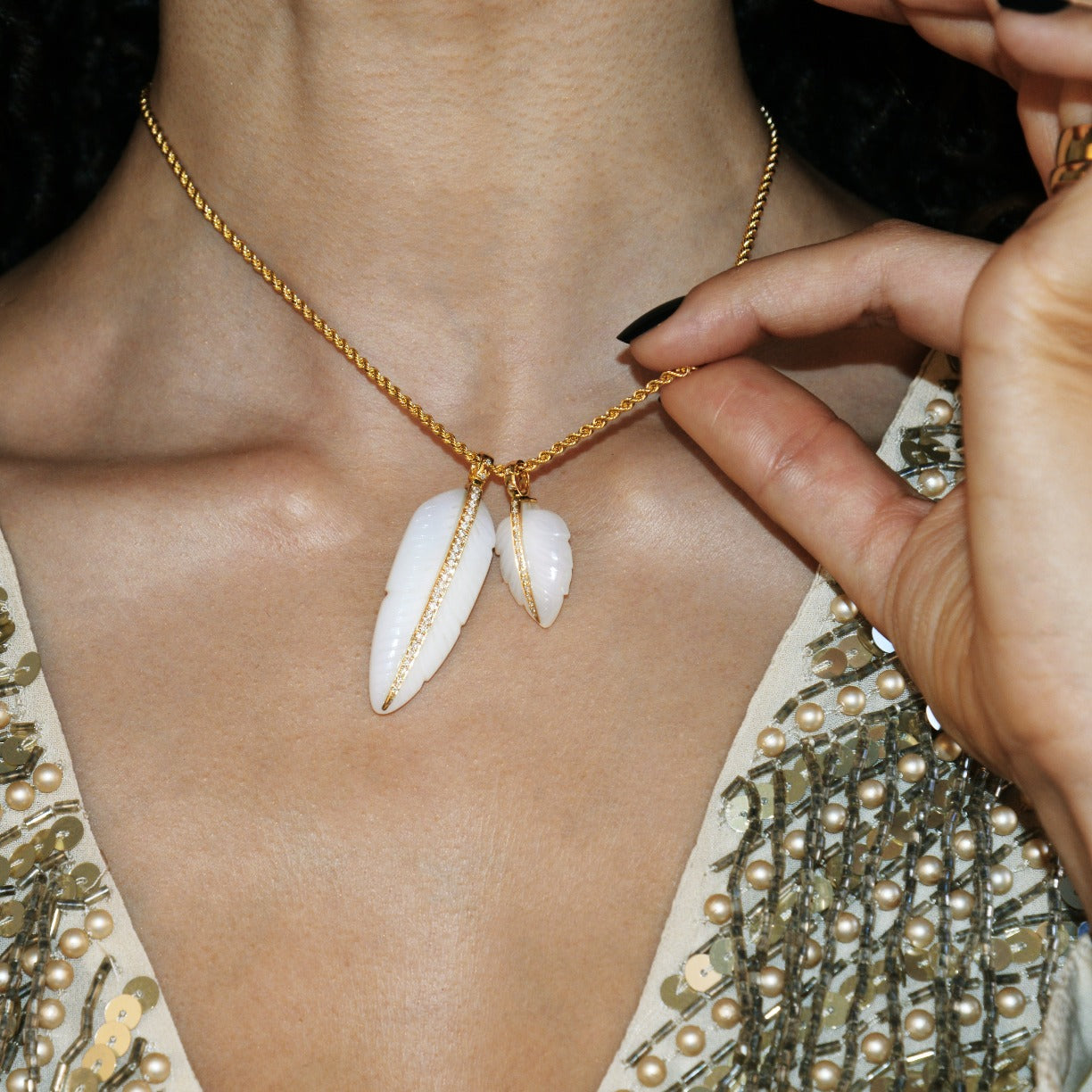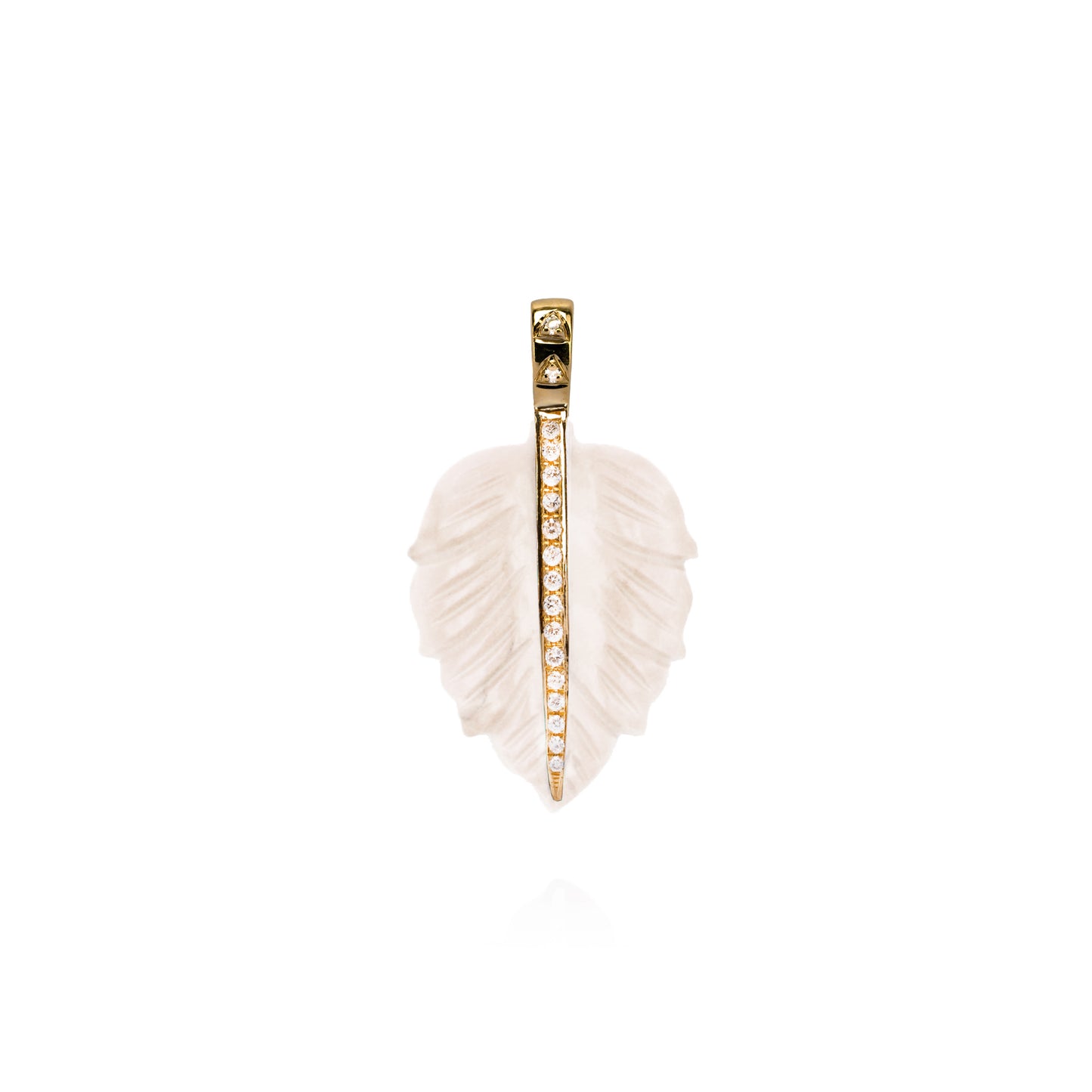 Ravissant pendentif en agate représentant une délicate feuille. Elle est sculptée à même la pierre selon la technique du carving. Cette feuille est pavée de 17 diamants sur un serti d’or jaune 14 carats. La feuille est le symbole du bonheur et de la prospérité. Ce pendentif peut aussi bien être porté sur une chaîne fine que plus épaisse grâce à sa bélière en or 18 carats décorée de petits diamants, qui est suffisamment large pour laisser passer des maillons de 3mm de diamètre. Pourquoi pas, également, porter ce magnifique bijoux sur une créole pour un look 100% fashion.