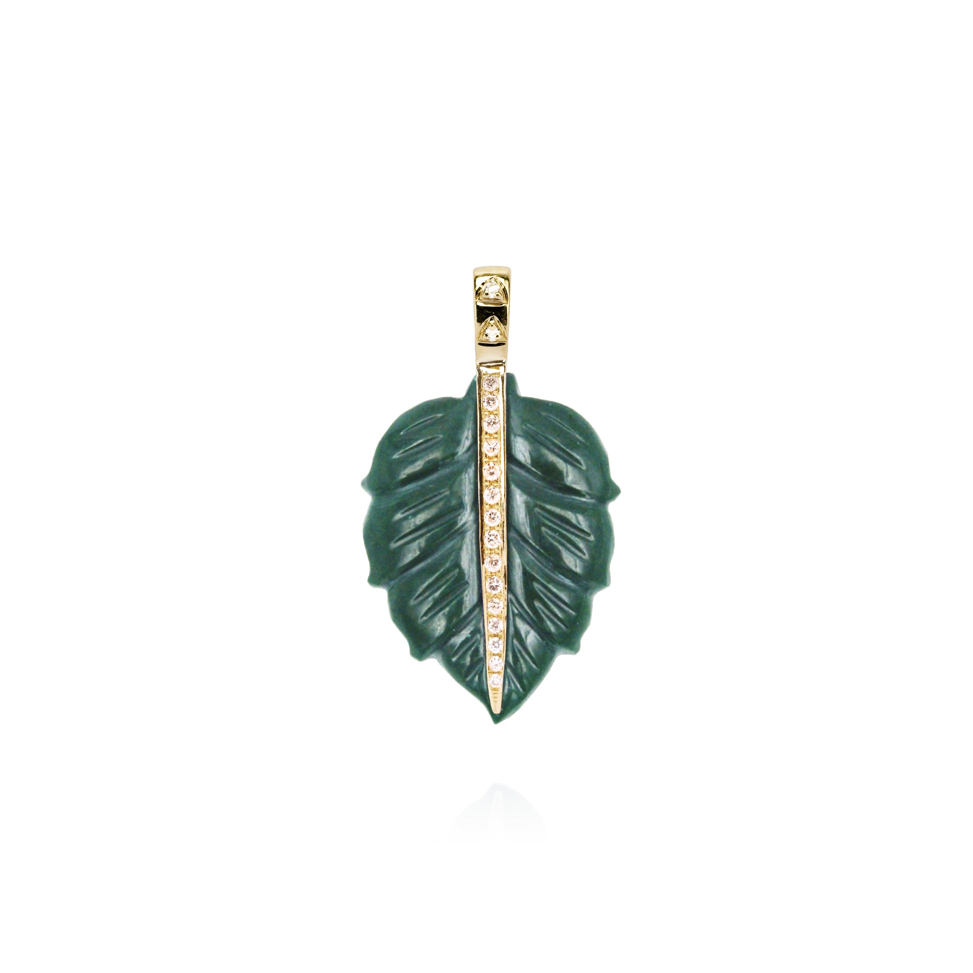 Ravissant pendentif en malachite représentant une délicate feuille. Elle est sculptée à même la pierre selon la technique du carving. Cette feuille est pavée de 17 diamants sur un serti d’or jaune 14 carats. La feuille est le symbole du bonheur et de la prospérité. Ce pendentif peut aussi bien être porté sur une chaîne fine que plus épaisse grâce à sa bélière en or 14 carats décorée de petits diamants, qui est suffisamment large pour laisser passer des maillons de 3mm de diamètre. Pourquoi pas, également, porter ce magnifique bijoux sur une créole pour un look 100% fashion.
